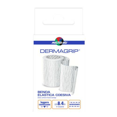 MASTER•AID DERMAGRIP Benda elastica Dispositivo medico CE. Benda garza elastica autobloccante impregnata di lattice per l'auto-aderenza. Aderisce su se stessa ma non alla pelle né ai peli. Non è candeggiata, ben tollerata, è altamente conformabile e permette una elevata traspirazione. Possiede una estensibilità in lunghezza del 100% circa.