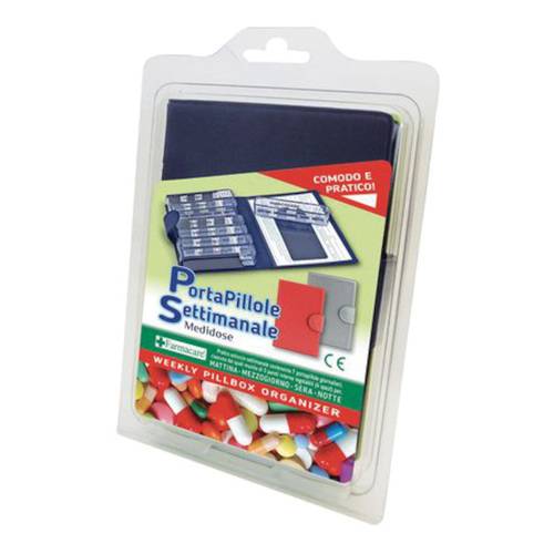 Pratico astuccio settimanale contenente 7 portapillole giornalieri, ciascuno dei quali munito di 3 pareti interne regolabili (4 spazi) per: mattino, mezzogiorno, sera, notte.